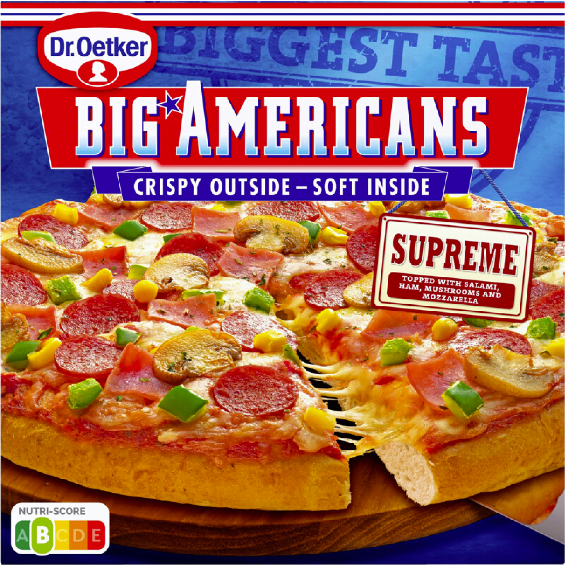 Ga voor een superieure smaaksensatie met Big Americans supreme! De Amerikaanse bodem is belegd met de beste salami, malse ham, zoete mais, lekkere champignons, knapperige paprika en mozzarella..